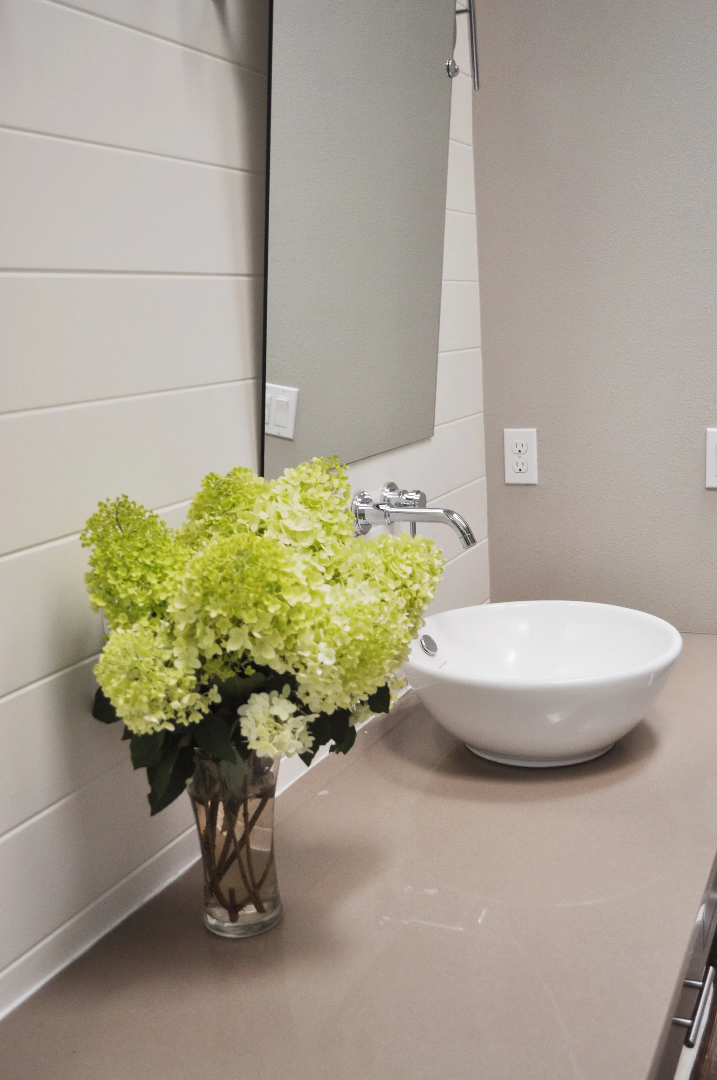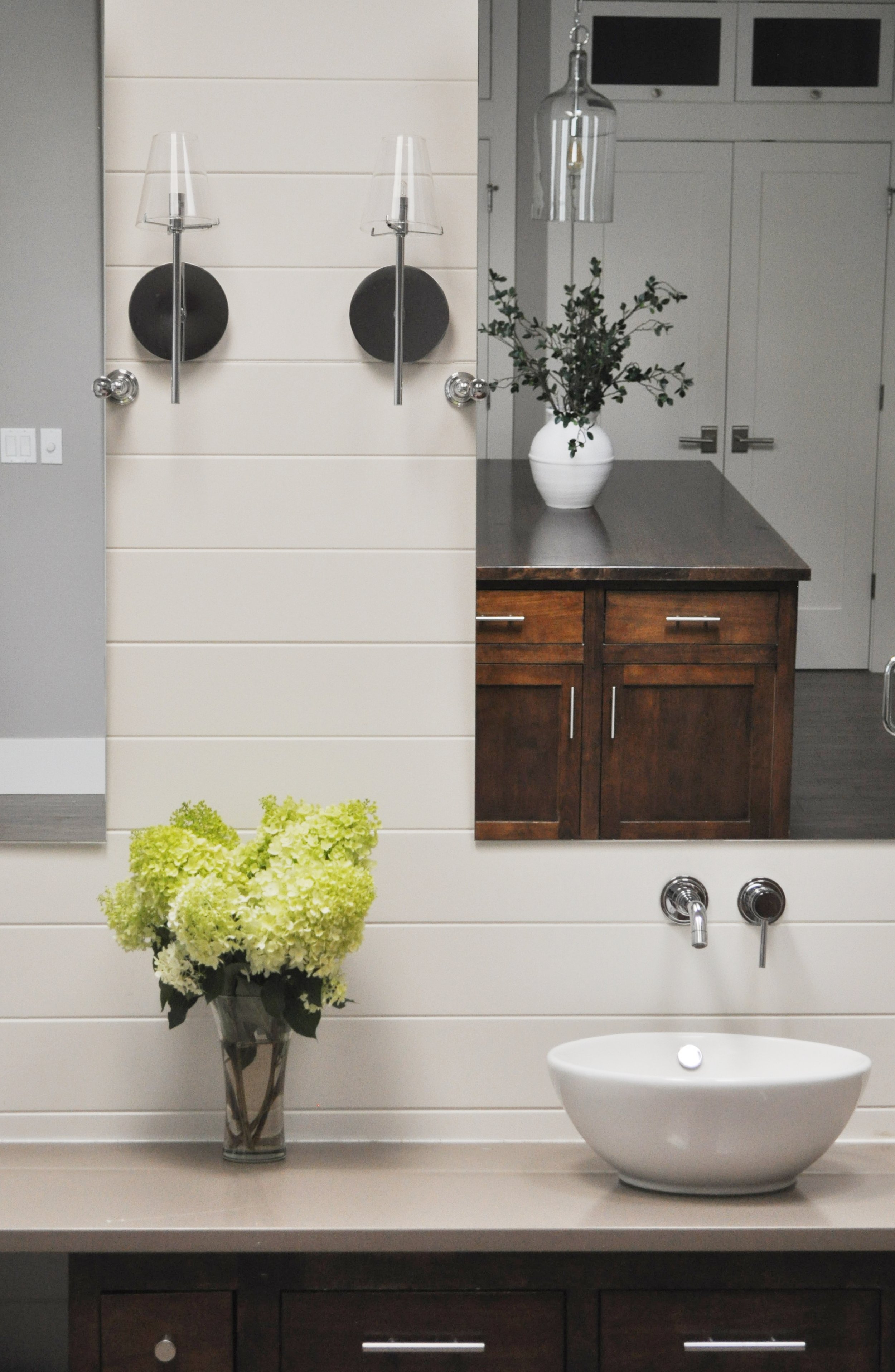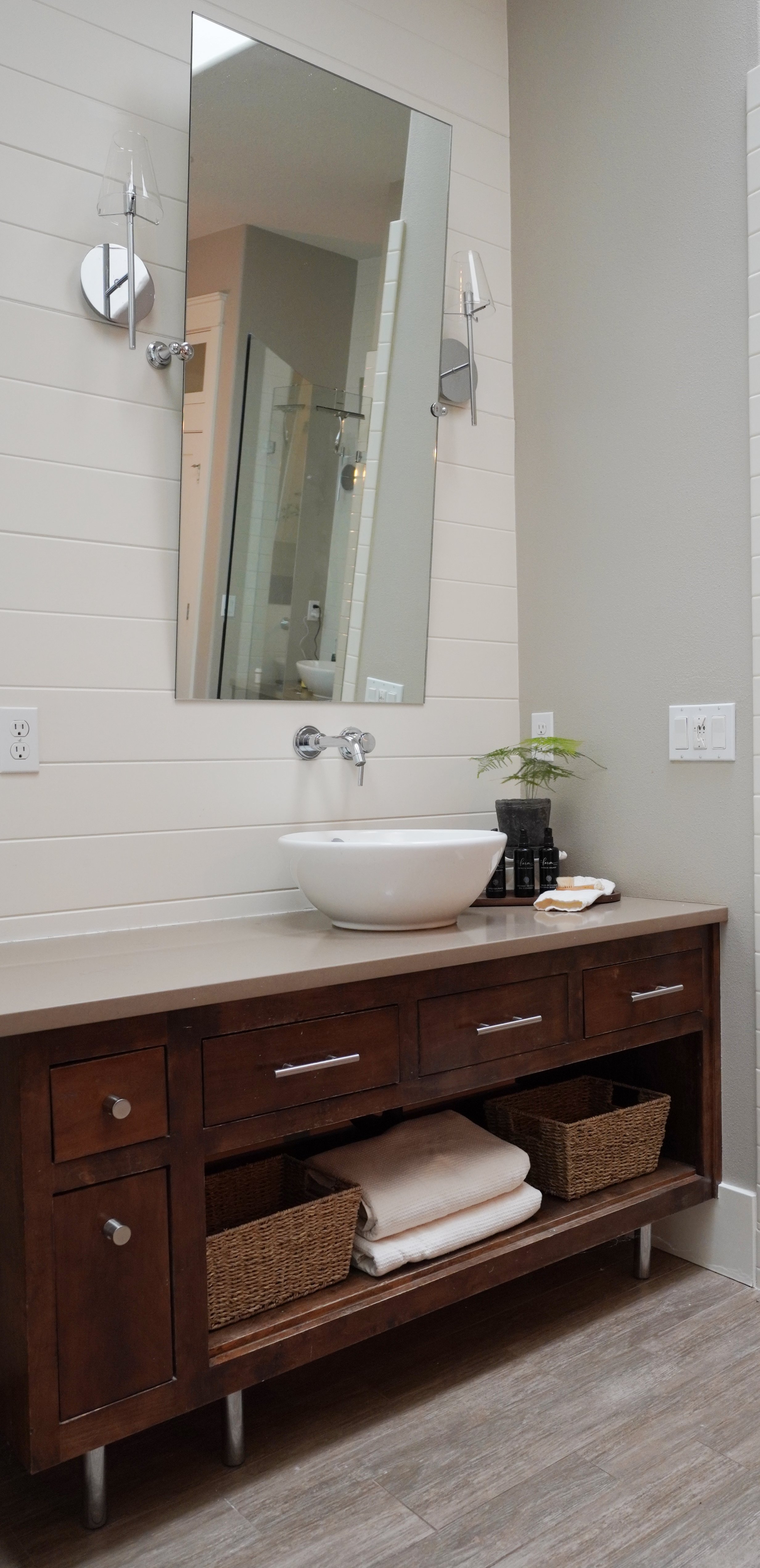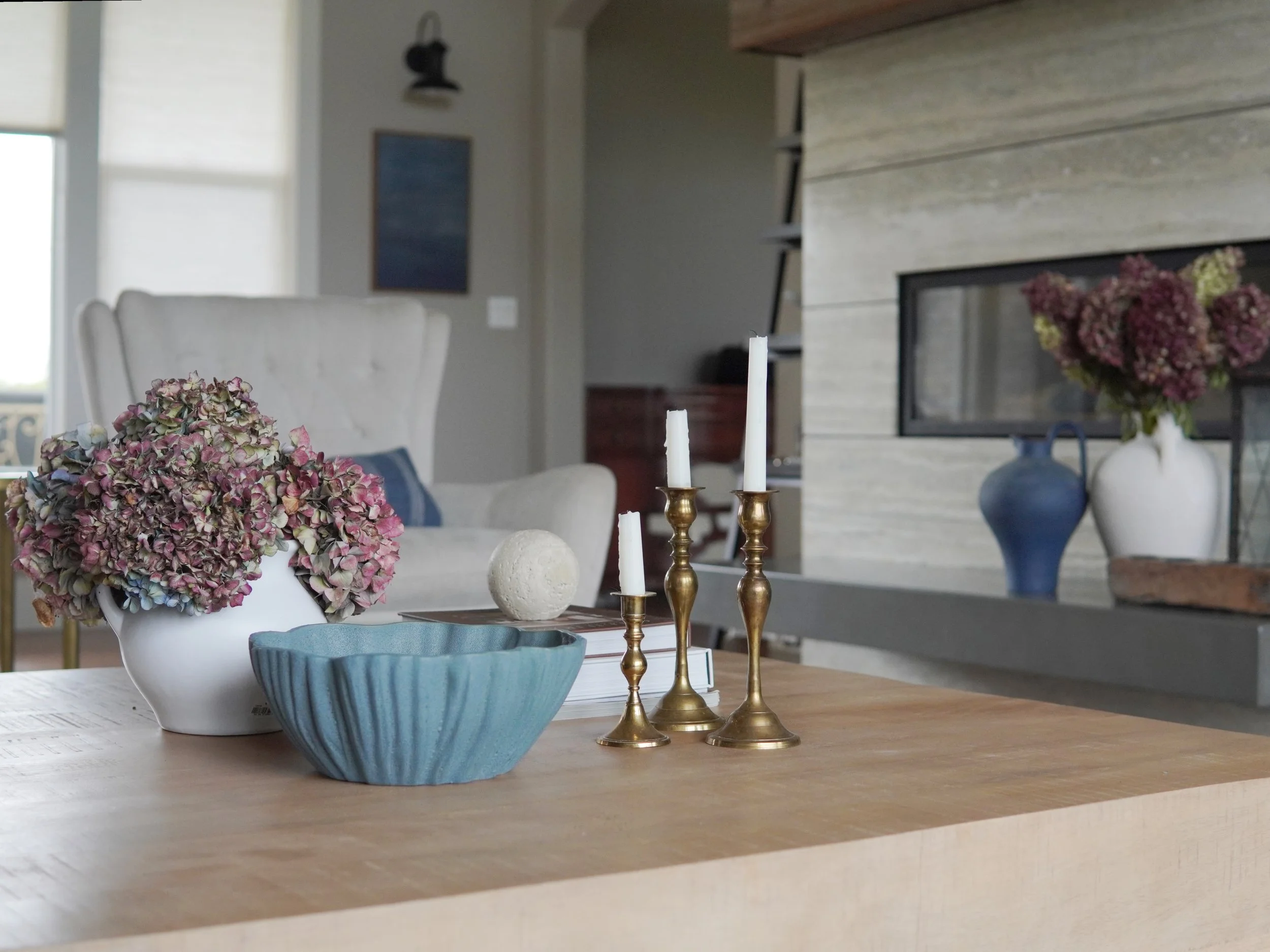 The fireplace creates a striking juxtaposition of modern horizontal travertine lines paired with reclaimed barnwood sourced from Sisters, Oregon.