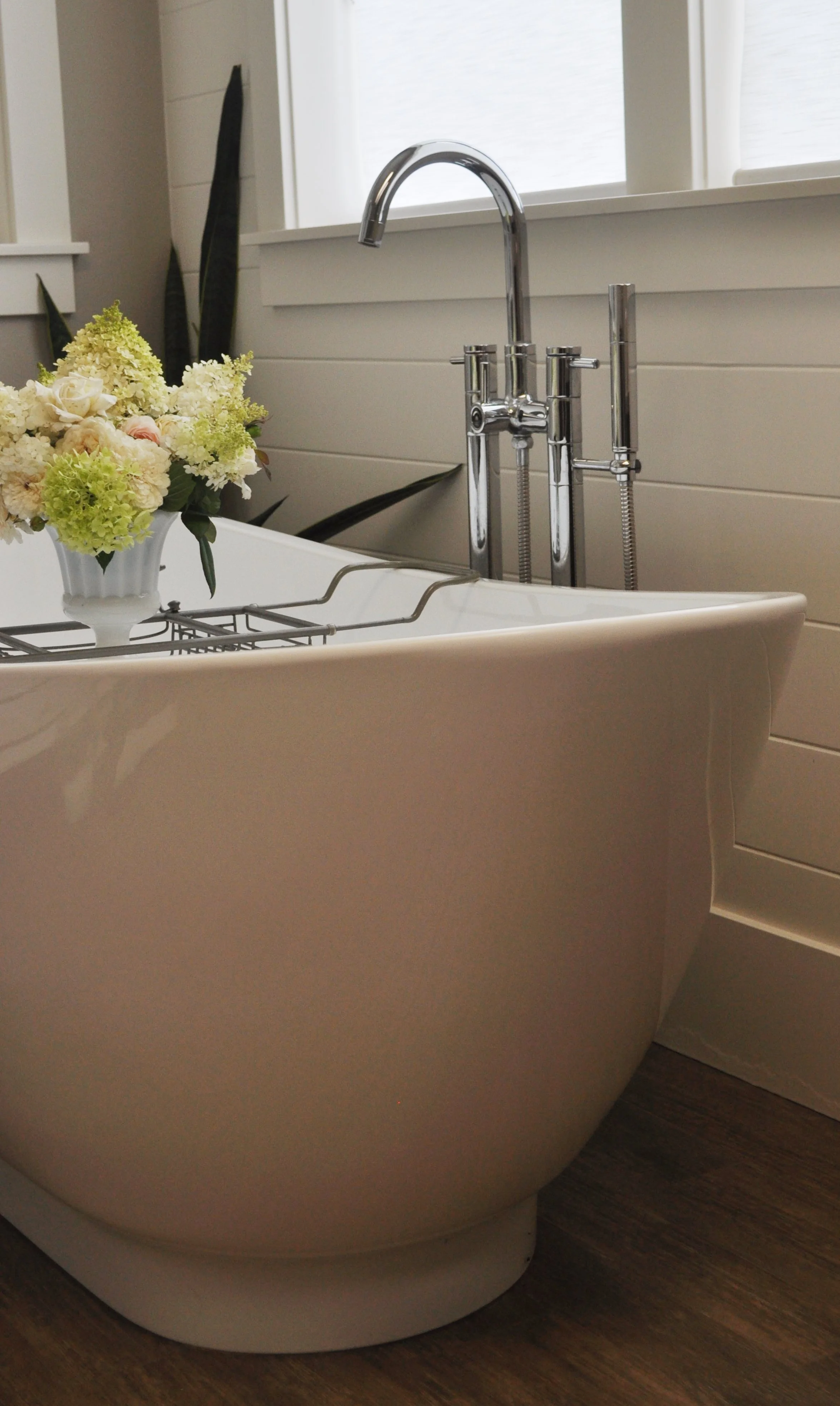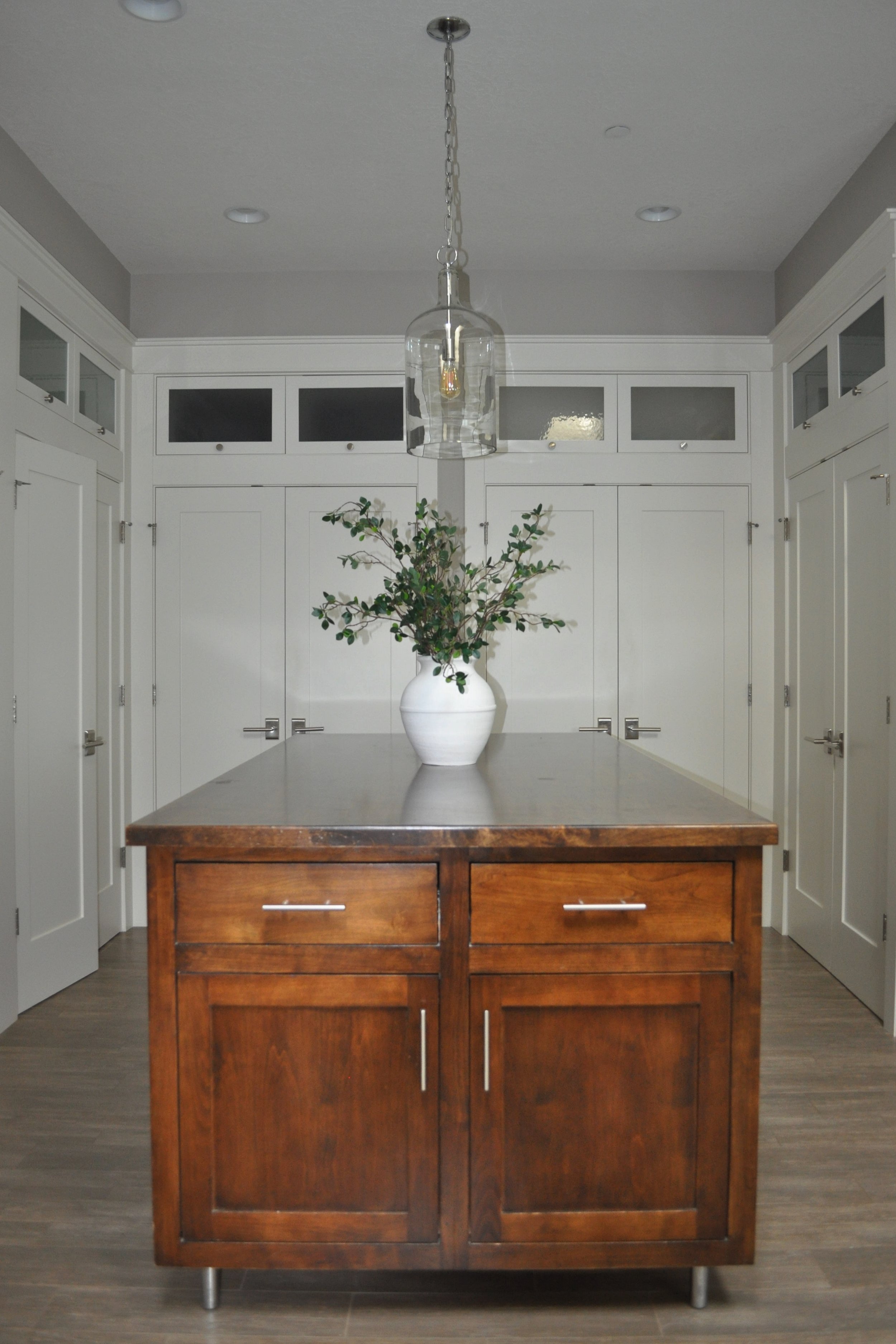 The primary suite offers an open concept bathroom and closet anchored by a custom center island with integrated his and hers hampers, thoughtfully concealed for a clean and elevated look.